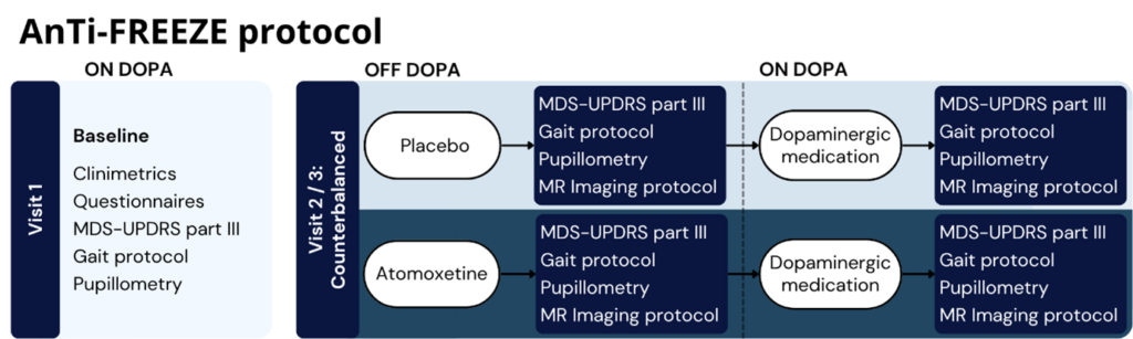 The AnTi-FREEZE study is a randomized controlled trial examining whether pharmacological modulation of the noradrenergic arousal system can reduce freezing of gait (FOG) in Parkinson’s disease (PD). We test the effects of atomoxetine, a noradrenaline reuptake inhibitor, on freezing severity. In a cohort of patients with FOG, atomoxetine is compared with placebo to assess its impact on both clinical symptoms and brain network connectivity. In parallel, we investigate the neural mechanisms linking arousal regulation to FOG. Furthermore, to identify individual characteristics that predict treatment efficacy, we evaluate clinical and neuroimaging markers, including FOG phenotype and the integrity of the locus coeruleus and substantia nigra. During the study, each participant undergoes repeated gait and MRI assessments under both treatment conditions, enabling robust within-subject comparisons. If effective, this approach could offer a novel treatment for FOG. More broadly, the study provides insight into noradrenergic mechanisms and advances our understanding of non-dopaminergic contributions to Parkinson’s disease, supporting the development of more targeted therapies.